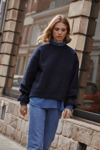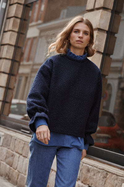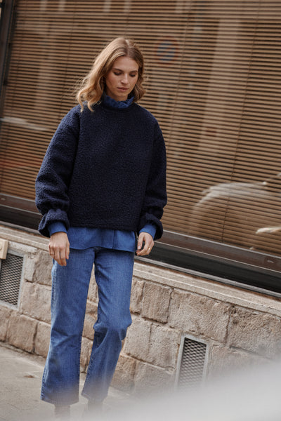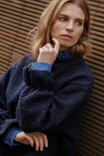 Ce pull que l'on aime pour son volume raffiné et ses détails délicats. Il se distingue par la douceur de son tissu effet laine bouclée, ses larges volants en bas de manches qui le rendent ultra féminin, et sa coupe oversize pour un look parfait ! Ultra confortable, il reprend les codes du sweat Nuage dans une version hivernale encore plus cosy, plus chaude et toujours plus douillette, parfaite pour vous garder au chaud cette saison ! En somme, le pull facile à porter qui ne laissera personne indifférent ! Associé à la chemise Plume en denim pour un look parfait.